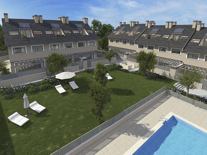 Viviendas de 390m2 construidos en cuatro plantas con ascensor privado, dos salones, cinco dormitorios y cinco cuartos de baño, garaje particular y amplio porche con acceso directo a jardín y piscina comunitaria